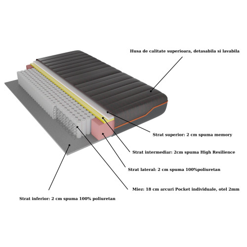 - 2 cm Smart Foam cu densitate de 25 kg/mc pentru suport suplimentar și durabilitate.
