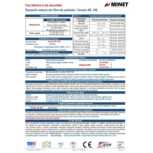 Netesutul geotextil Minet S.A. Valcea Teresin NS se obtine prin consolidarea mecanica a amestecului fibros din fibre poliesterice.