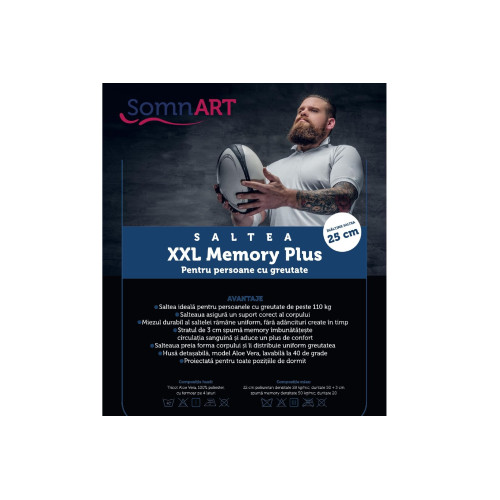 Saltea Cu Memorie Xxl Memory Plus 100X200, Înălțime 25Cm, Pentru Persoane Supraponderale, Husă Aloe Vera Detașabilă, Rulată, Fermitate Mare